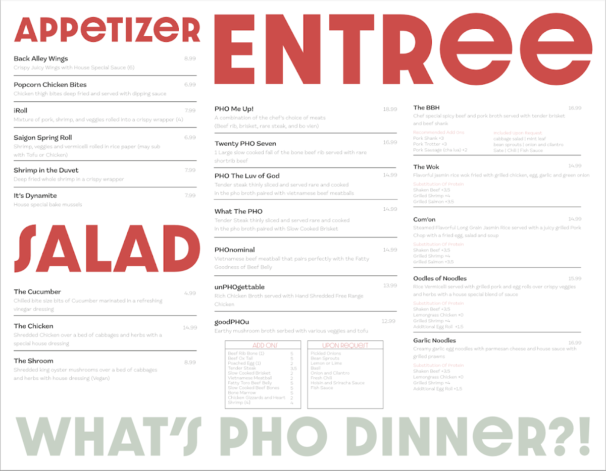 For those fond of traditional flavors, the Pho Me Up! serves a rich broth paired with tender ribeye, providing an unforgettable dining experience. Don't overlook the fresh side dishes like the Cucumber Salad that refreshes the palate. To wash it all down, enjoy the complimentary refills of their aromatic Jasmine Tea.